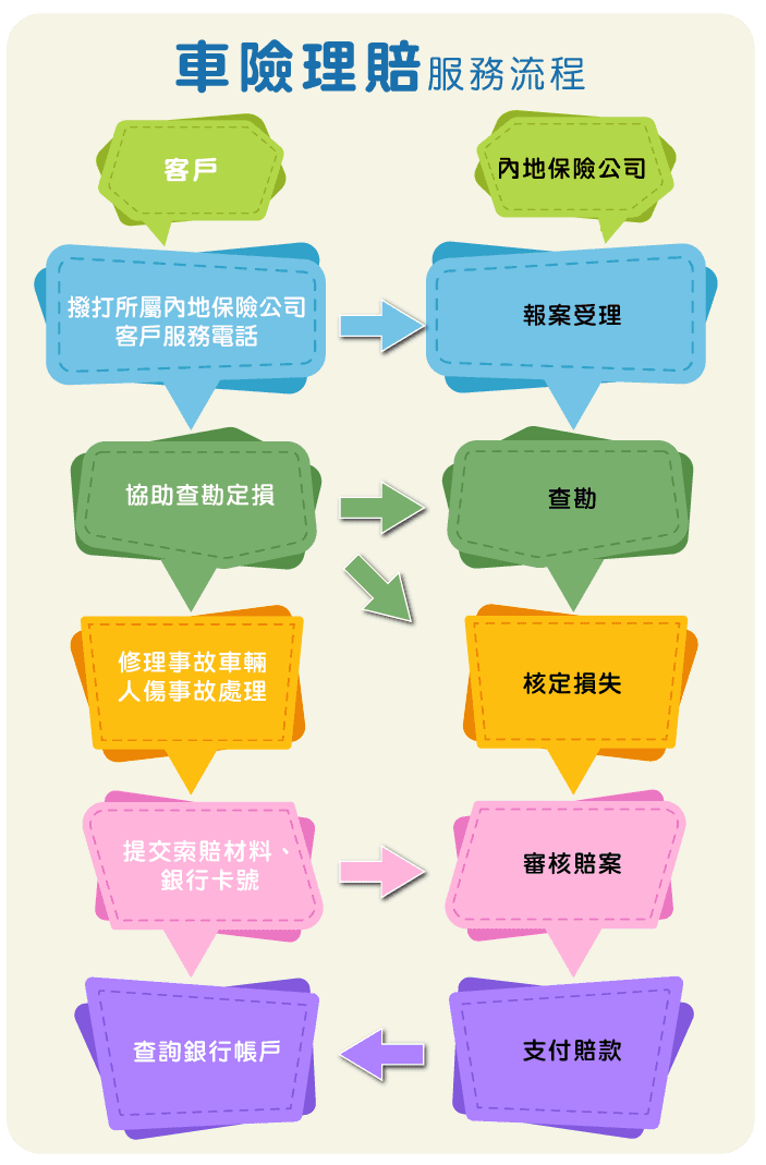 車輛出險後,48小時內撥打所屬內地保險公司24小時服務熱綫報案電話,以及致電122報交警處理。案件需由所屬內地保險公司理賠人員現場查勘,或經理賠人員指引後進行交警處理或事故雙方自行協商處理。